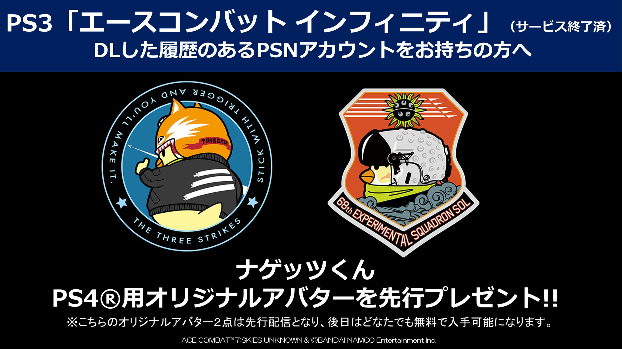 エースコンバット公式 Ps3 エースコンバット インフィニティ サービス終了済 をご応援いただきました空賊の皆様へのお礼として ナゲッツくんのps4用オリジナルアバターを配信開始 同作をdlした履歴のあるpsnアカウントをお持ちの方は Ps Storeから